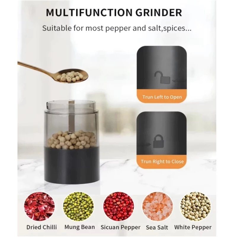 ✔️ Creative LED Design – The LED light is cleverly placed at the top of the grinder, allowing bright illumination through the transparent container via light refraction. This makes seasoning easier and cleaning the container simple with water.