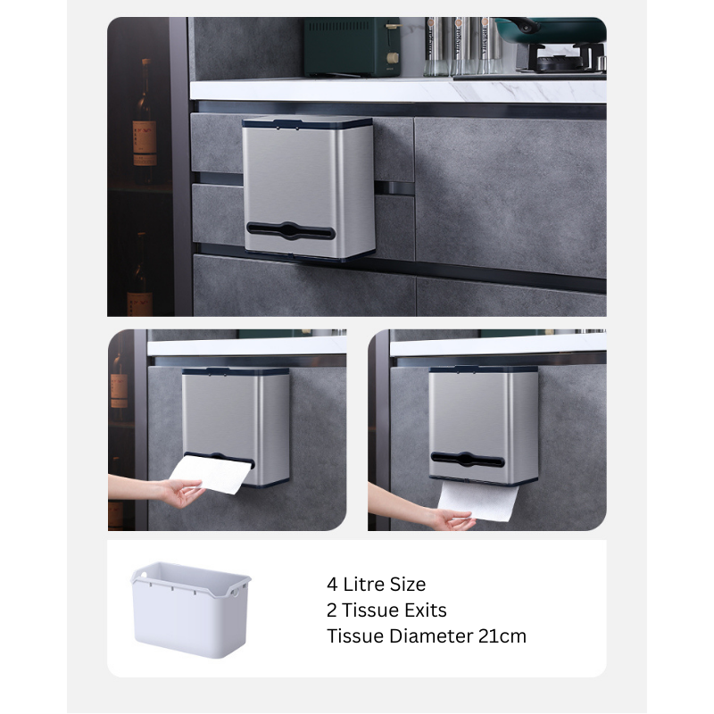 Premium 430 Stainless Steel Hanging Kitchen Bin 4L 6L Wall Mounted Trash Can with Tissue Box | Silent Slide Lid | Inner Bucket